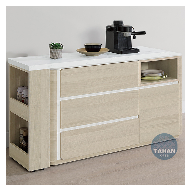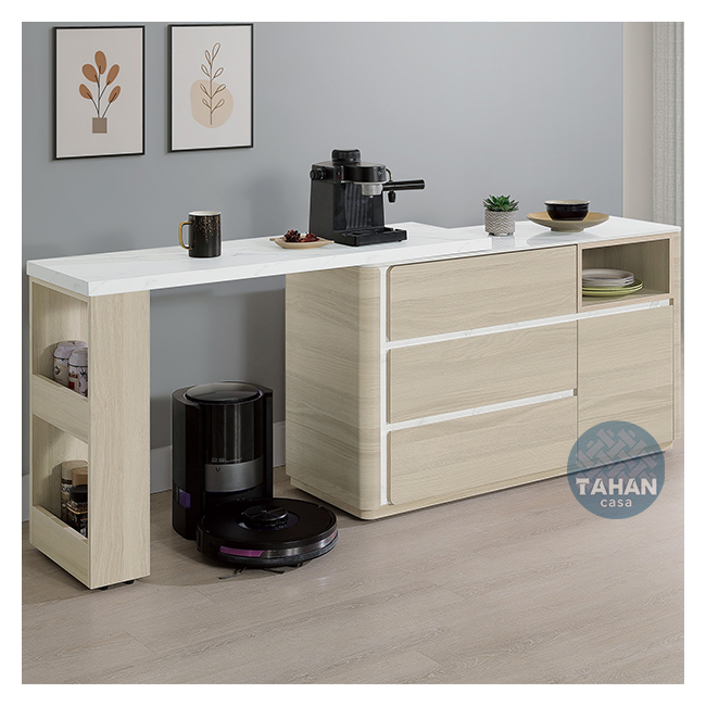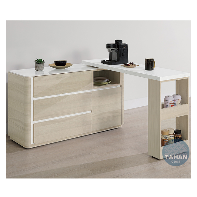 收納櫃桌面:採12mm亮面雪山石岩板面,具耐磨、耐熱特性
