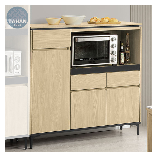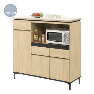 4尺木面餐櫃,附1大2小活動隔板、1個出線孔,烤漆黑鐵腳高度12.5cm